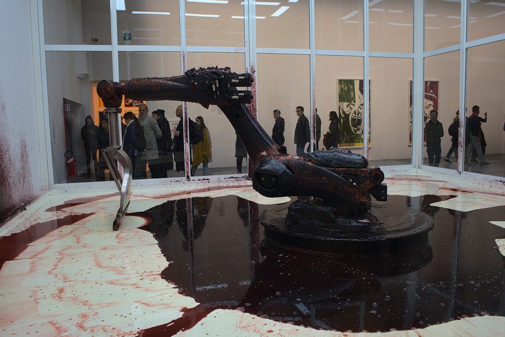 Ein Roboterarm, umgeben von durchsichtigen Acrylwänden, hat eine einzige Aufgabe: eine tiefrote, zähflüssige Flüssigkeit in einem festgelegten Bereich zu halten. Sobald die Sensoren erkennen, dass sich das Medium zu weit ausbreitet, beginnt der Arm hektisch zu arbeiten, schiebt es zurück, verschmiert es auf dem Boden, spritzt es an die Wände. Eine endlose Schleife. Anfangs, als das Werk 2016 im Guggenheim Museum installiert wurde, konnte der Roboter spielerisch mit dem Publikum interagieren – programmierte Bewegungen, fast wie Tänze. Doch mit der Zeit wurde der Kampf gegen die auslaufende Flüssigkeit immer verzweifelter. Die Maschine, einst agil, wirkte irgendwann müde, erschöpft. Schließlich kam sie 2019 zum Stillstand.