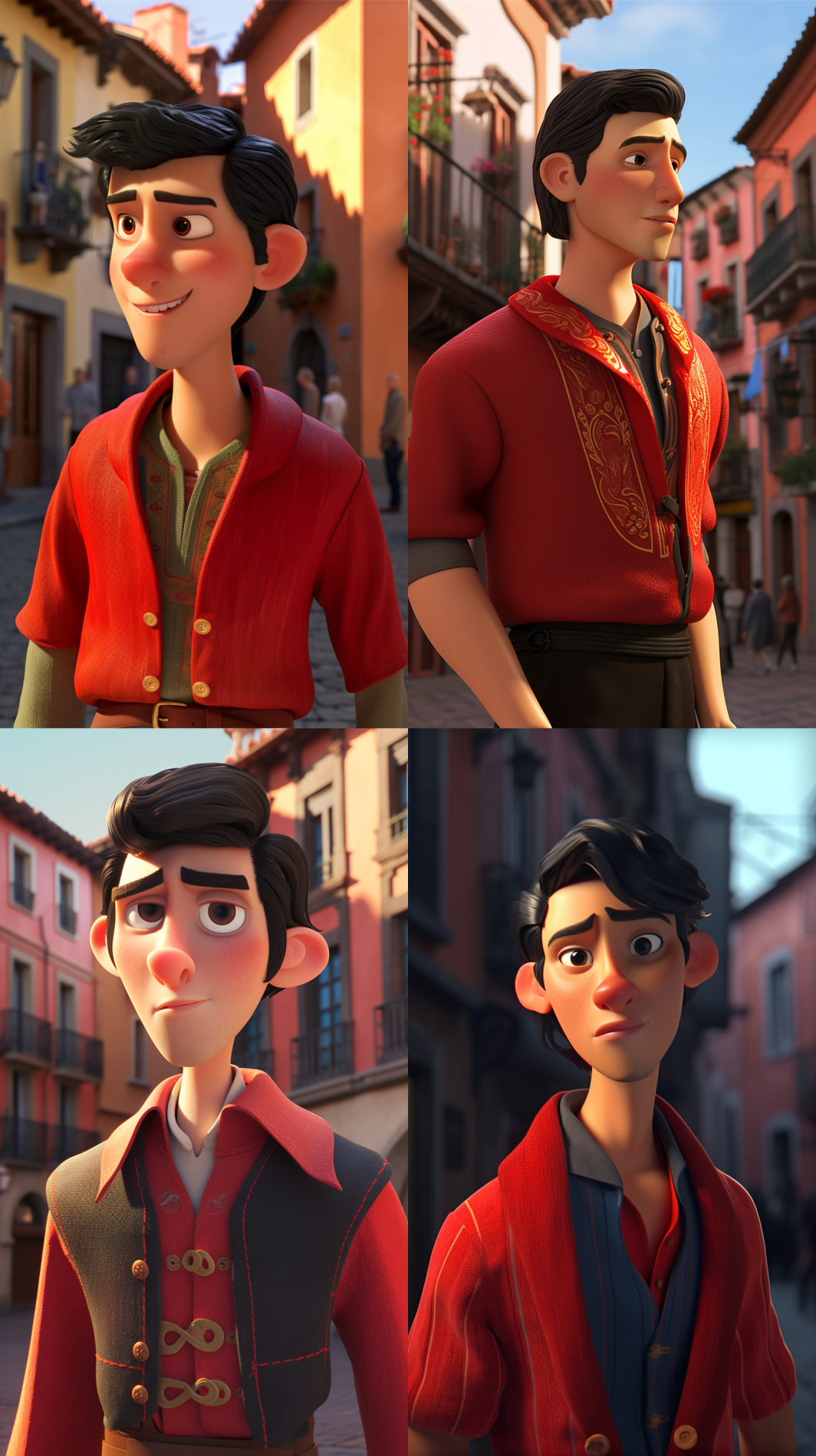 Prompt: A portrait of young, dynamic Pixar 3D animation dark hair, brown eyes, wearing traditional Spanish clothes in red and black colors, set in a vibrant, action-packed traditional Spanish city. The animation should have expressive movements and facial expressions. The environment should include narrow, winding streets with colorful buildings, vibrant street markets, and historical landmarks such as fountains and plazas. The mood and atmosphere should convey excitement and energy, with a sense of cultural pride and celebration. The prompt should be realized as a digital illustration with bold colors, intricate details, and high contrast. — ar 9:16 — v 5
