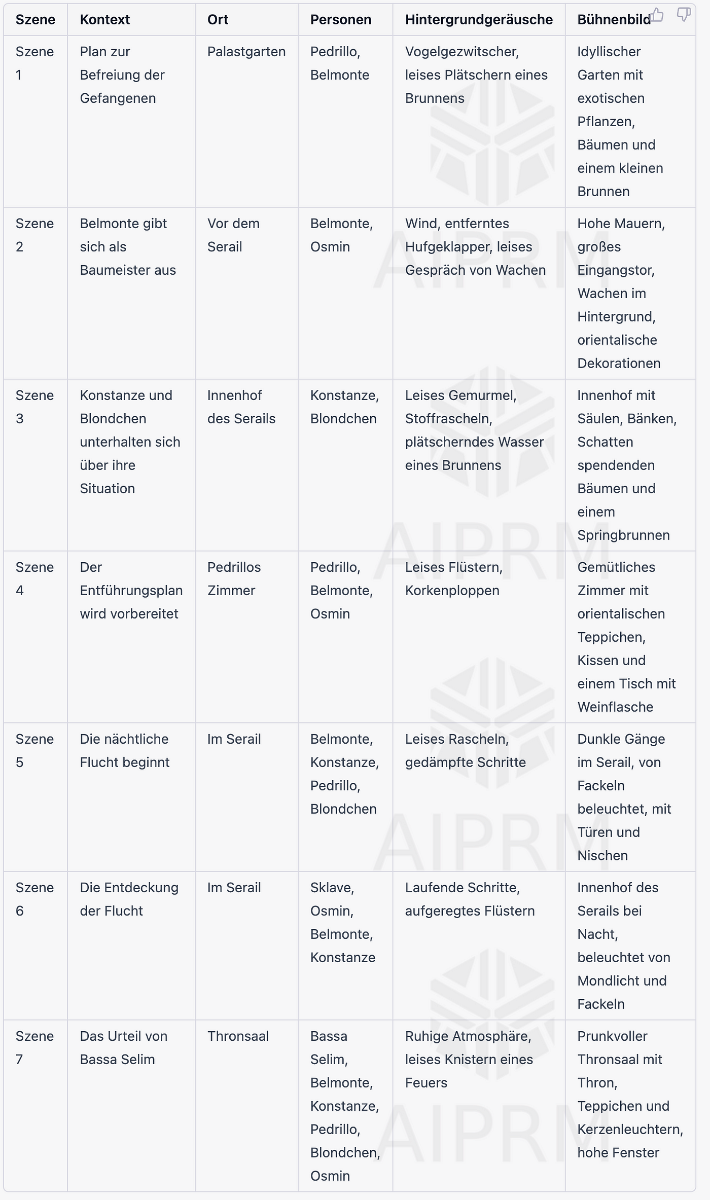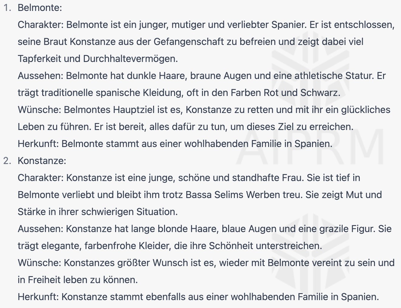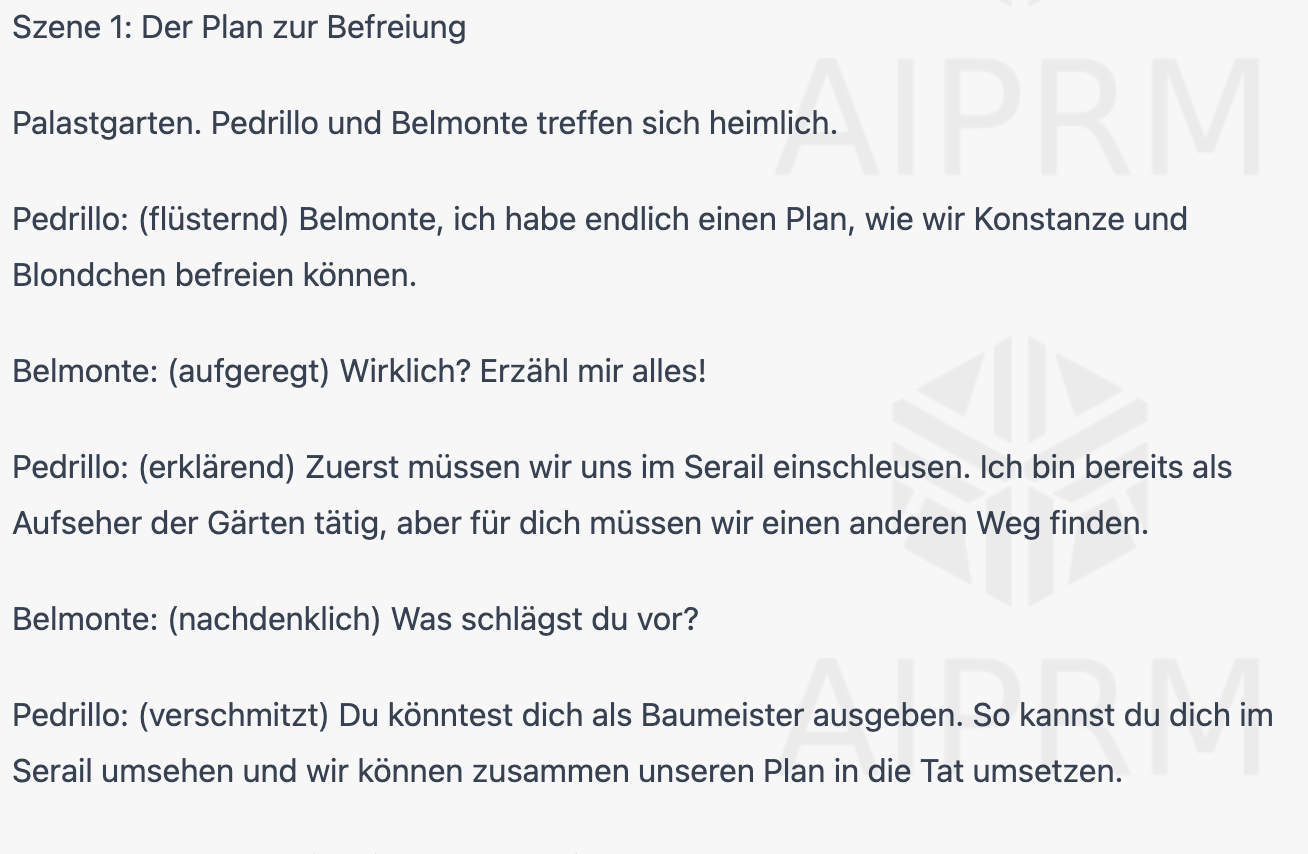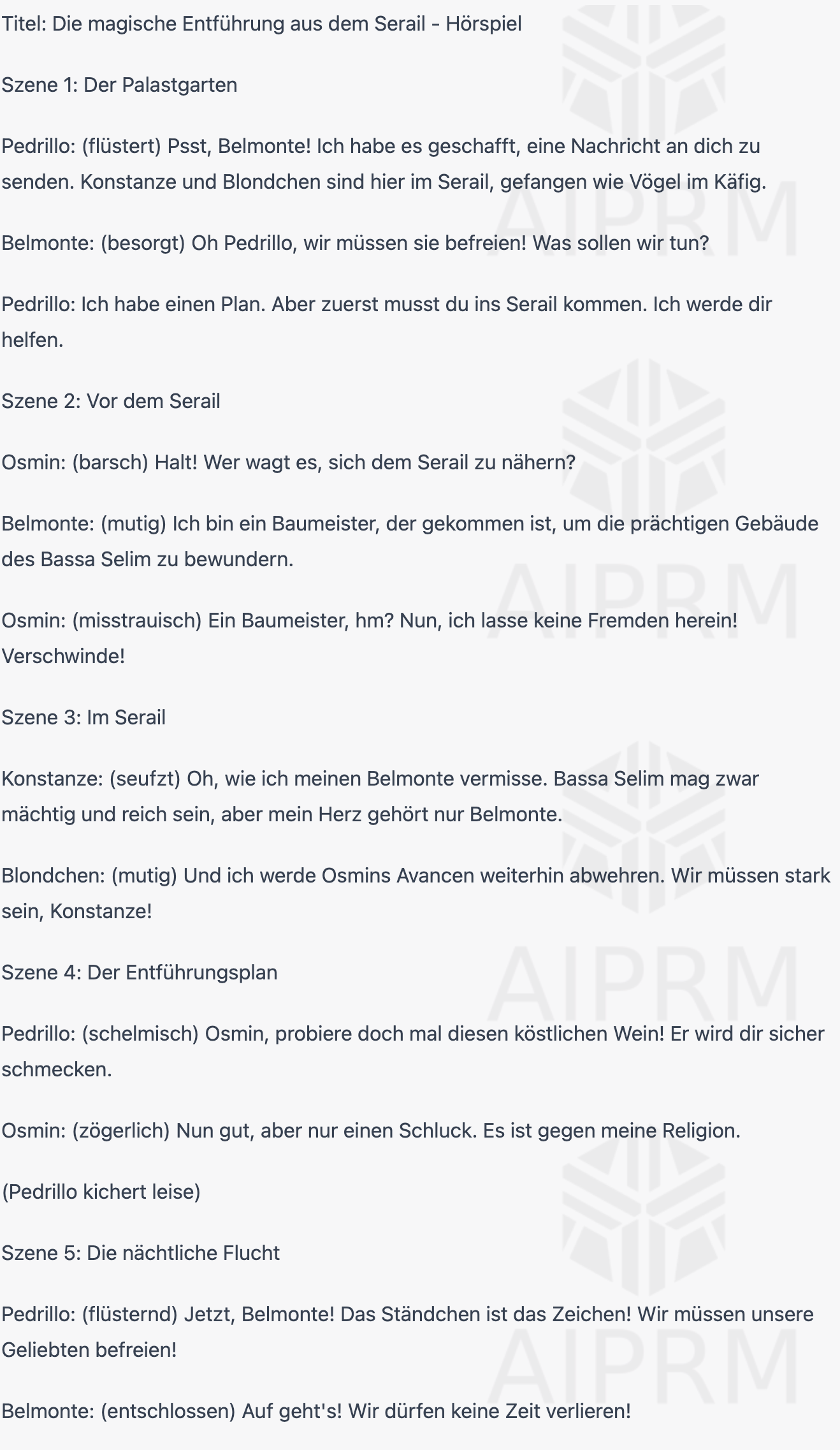 Prompt 1: Schreibe ein Manuskript für ein Hörspiel für Kinder einer 5. Klasse in Dialogform über das Singspiel: Die Entführung aus dem Serail von Mozart. Beschreibe die Charaktere bildhaft. Sei unterhaltsam. Please write in sympathetic tone, creative writing style, German language.