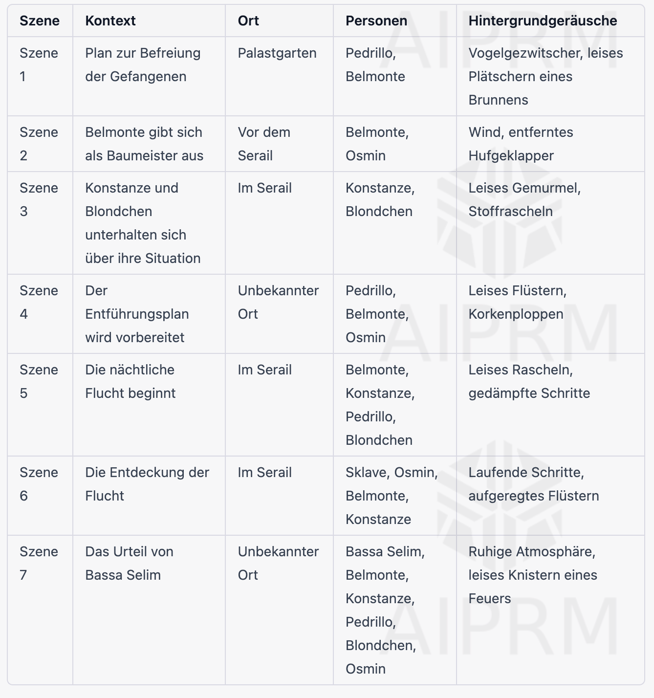 Prompt: Ordne jetzt in einer Tabelle jeder Szene einen Kontext zu. Benenne, wo die Szene spielt, was die Personen gerade machen und welche Hintergrundgeräusche dabei zu hören sind.