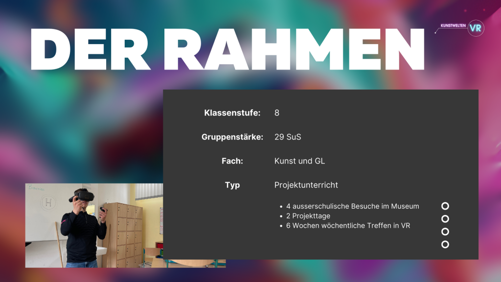 Das Kunstwelten VR-Projekt bietet den SchülerInnen der Jahrgangsstufe 8 eine einmalige Gelegenheit, ihre eigene, öffentliche Kunstgalerie zu erschaffen und in ihr eine Vernissage zu veranstalten. Das Projektdesign basiert auf dem klassischen Projektunterricht und ist darauf ausgelegt, interessendifferenziert zu arbeiten. Die Schülerinnen und Schüler haben nach einer einführenden Erarbeitung des Themas und des Ziels des Projekts die Möglichkeit eins der Tätigkeitsfelder zu wählen. Künstlerinnen, Technikerinnen und Kuratorinnen.